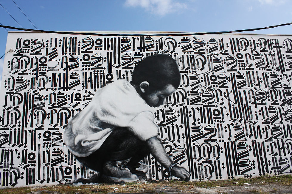 RETNA accesses spaces between text-based imagery and abstract emotive states with his mysterious lines of verse. Each block of text is a sophisticated system of hieroglyphs, calligraphy and illuminated script. With influences from Arabic, Egyptian, Hebrew, Anglo-Saxon (or Old English) and Native American typographies, RETNA’s distinctive language communicates a personal form of poetry. RETNA’s messages are masked in ciphers: words and meanings that are never immediately revealed, nor capable of being accurately translated. He employs ancient totemic symbologies as a baseline, overlaid with beats from the urban jungle (sourced from his background in Los Angeles, born from Pipil – western indigenous El Salvadorian – Cherokee, Spaniard, and African-American bloodlines. These diverse subcultures are channeled into his work, often accompanied (either in the studio or on the street) by a stream of ambient or musical sounds. It is this multi-sensory experience that is brushed onto the surface for RETNA: a synthesis of auditory and visual content, spontaneously manifested.