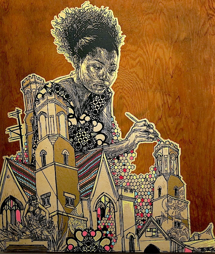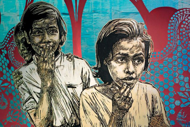 Swoon often pastes her work depicting people, frequently of friends and family on the streets around the world. These works are usually located in uninhabited locations including abandoned buildings, bridges, fire escapes and water towers to name a few.